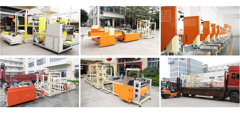 自動化制作工序:卷材自動上料 --- 自動對折邊 --- 自動穿繩 --- 恒溫系統壓合 --- 自動對折 --- 自動手挽帶焊接 --- 自動插邊 --- 位置控制 --- 自動打孔 --- 立體成型 --- 恒溫系統壓合 --- 自動分切 --- 完成制作.