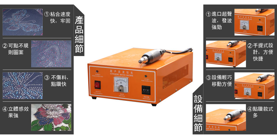 鴻達”牌超聲波點鉆打版機結合先進的超聲波工藝,能瞬間將各種規格的燙鉆熔化貼合在材料之上,使燙鉆定位精美,擺脫了長期以來用膠水粘鉆所帶來的困擾。給燙鉆帶來了更多方便,可廣泛應用于鞋類、內衣、童裝、T恤、婚紗、皮革、手袋、發飾、帽子及其它飾品行業,很大程度上降低人工,是一款高效的替代產品。