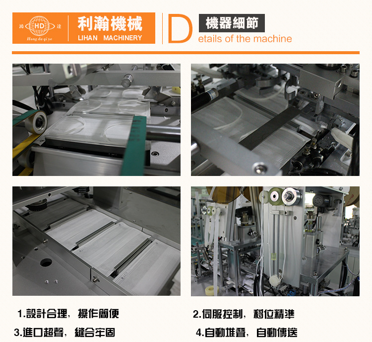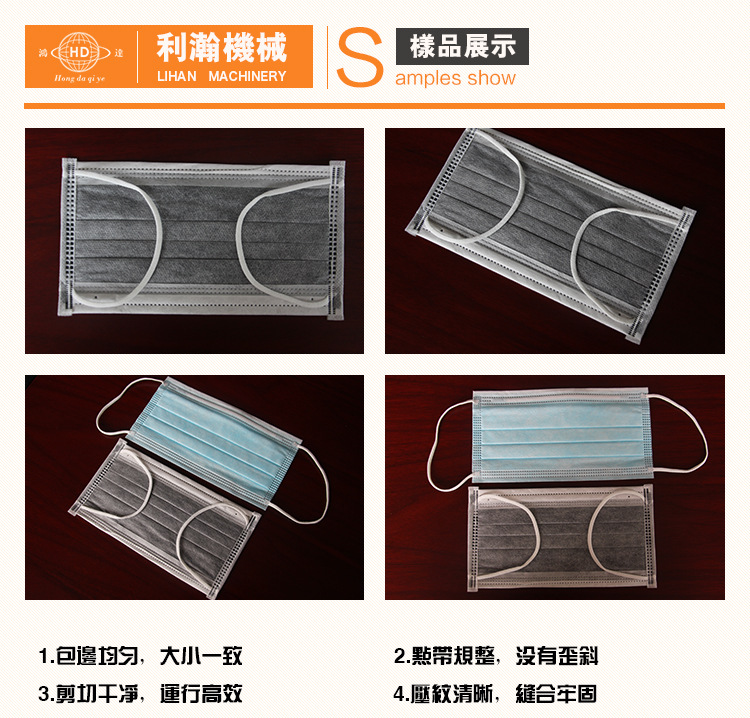 “鴻達(dá)”牌全自動(dòng)內(nèi)耳帶包邊上帶機(jī),本機(jī)自動(dòng)化程度高, 經(jīng)過(guò)PLC編程操控,產(chǎn)量比較高。特別的制造工藝保證在出產(chǎn)口罩時(shí),包邊后平坦,壓邊紋理清析、包邊均勻且功率極高,然后有用的保證 了出產(chǎn)出的口罩質(zhì)量;