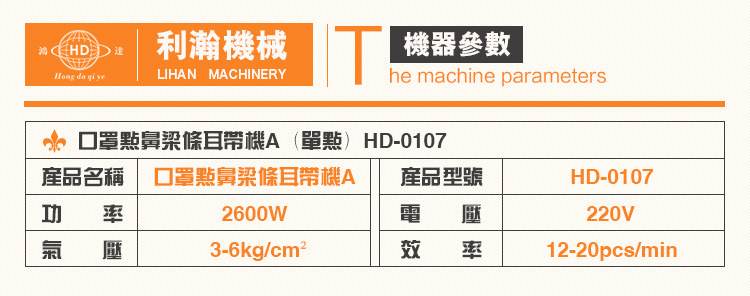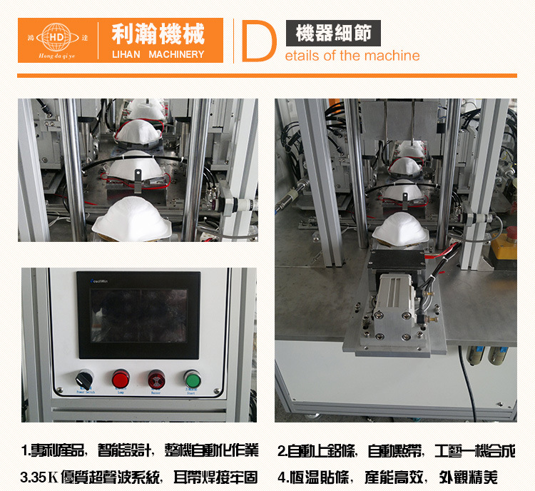 該機是利瀚公司針對防塵口罩而精心研發杯型口罩自動化上帶的配套設備,該設備自動化程度較高, 將傳統比較冗雜的口罩出產工藝進行技能革新,實現從口罩鼻梁條焊接、耳帶焊接一次完結,然后大大的提高質量與產能。