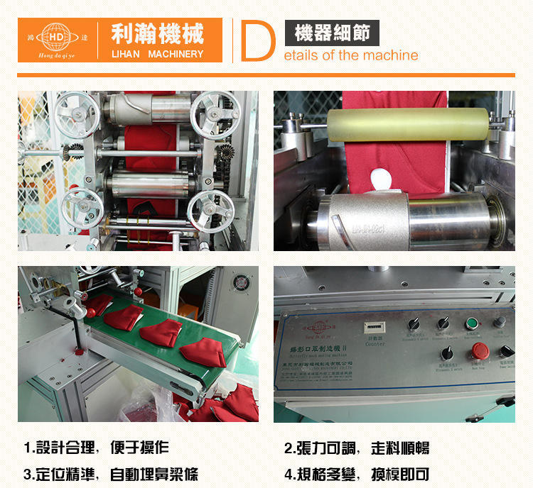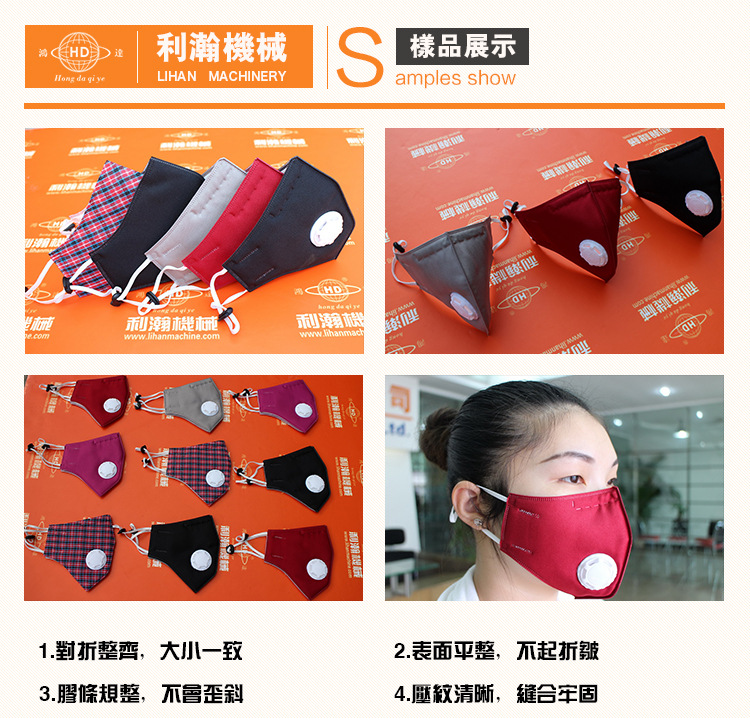 “鴻達牌”折疊型布料口罩機,是依據市場需求精研出來的一款口罩設備,制造出來的口罩防護作用很強,有口罩之中的呼吸專家之稱。 本機運用3~6層口罩資料(如:布料、無紡布、活性炭和過濾棉布等),使用優質進口超聲波進行無線縫合、打孔、半數、打孔到出產出布料口罩的本體,效率高,質量安穩,外觀精巧,從而將傳統的車縫口罩工藝進行技能革新