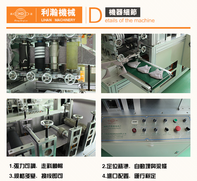 “鴻達(dá)”牌全自動C形口罩機,是利瀚企業(yè)依據(jù)客戶要求, 在國內(nèi)研制成功國外市場買點特別杰出的一款全自動口罩機,本機自動化程度高, 經(jīng)過PLC編程操控,可做到口罩壓紋、半數(shù)、穿孔、切邊一次成型,特別的制作工藝確紋理清析、在出產(chǎn)時不變形,可 大極限的削減資料糟蹋,并且有用的確保了出產(chǎn)出的口罩質(zhì)量;“鴻達(dá)”牌C形口罩機是拓寬國外市場, 尋覓口罩商機的首要設(shè)備。該機亦稱蝶型口罩機,是出產(chǎn)折疊口罩的全自動機器。該機運用超聲波技能,將3--5層的pp無紡布、活性炭、以及過濾資料粘合,并剪切出折疊口罩本體,依據(jù)所運用的原資料不同,所出產(chǎn)口罩能夠到達(dá)FFP1FFP2N95等不同的規(guī)范,耳帶為彈性帶,使佩帶者耳部舒暢,無壓力,口罩過濾布層過濾作用好,齊備符合亞洲人臉型,可適用于醫(yī)療、電子、修建、礦業(yè)等職業(yè)。