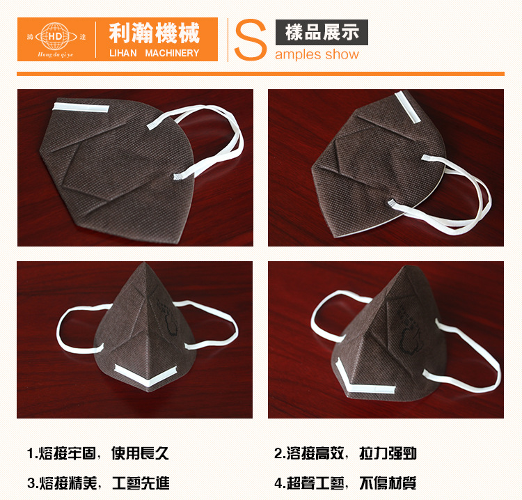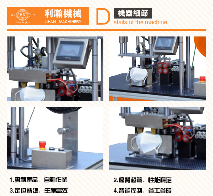 “鴻達”牌口罩外置鼻線熔接機是利瀚專為口罩貼鋁條而規(guī)劃的新產(chǎn)品, 該設(shè)備是使用程序控制完結(jié)主動化出產(chǎn),從鼻線進入、主動剪切、恒溫熱壓貼 條均為主動化作業(yè)。制品外觀精巧,貼條結(jié)實,產(chǎn)能高效。