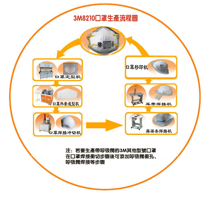 按一*天10小時工作時間來算,該條線設備一*天產能在10000個左右口罩成品,該套設備另行增加呼吸閥沖孔機、呼吸閥焊接機等兩套設備,可生產3M其他款帶呼吸閥的口罩產品。